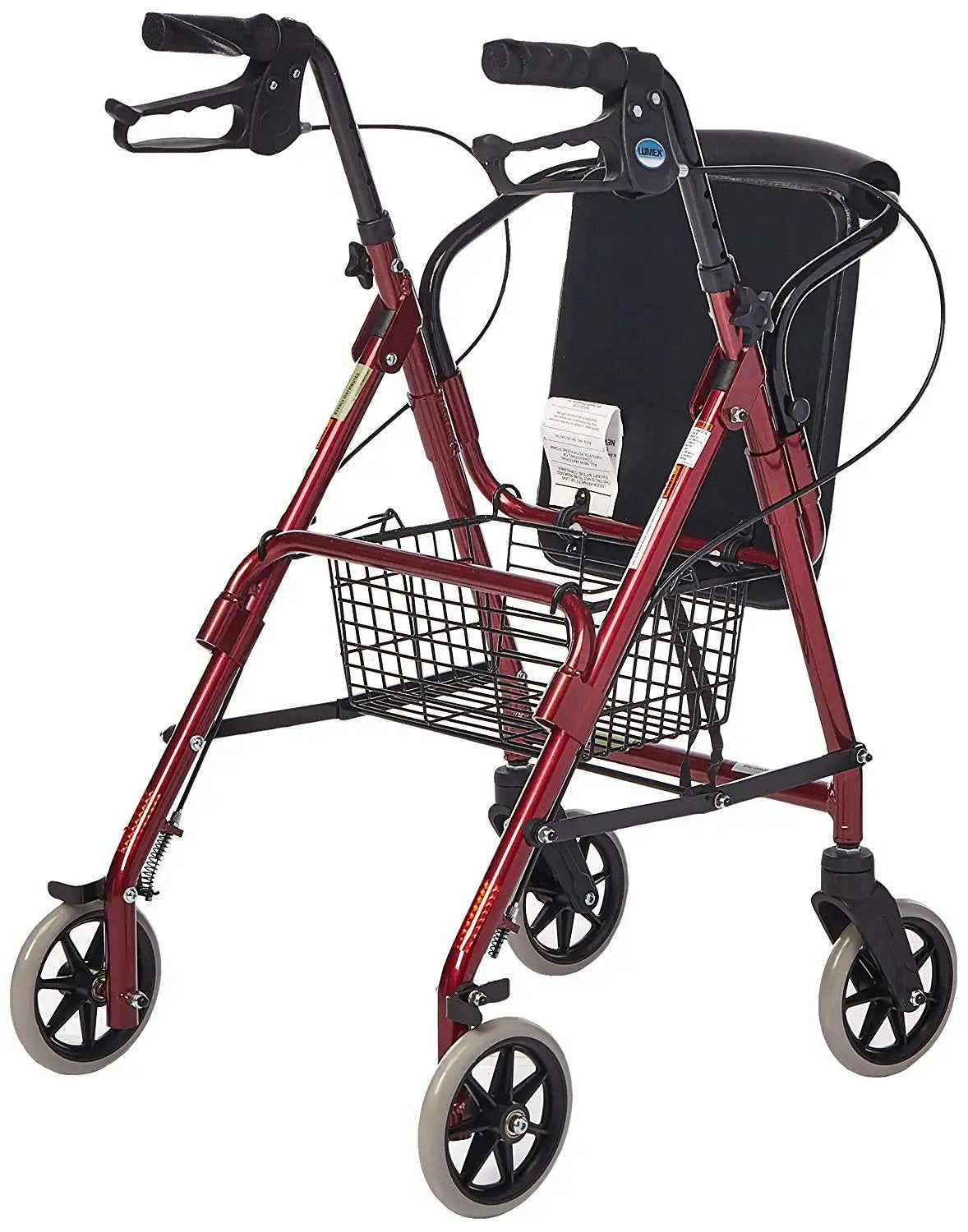 - Padded seat flips up easily for access to storage basket or for folding